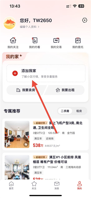 2、在我的页面中,点击添加我家选项并点击,进入房源信息的填写界面。