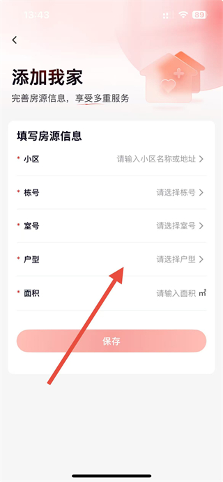 3、在添加我家页面,依次填写小区等必填房源信息,点击保存按钮,完成房源信息的添加操作。