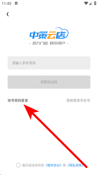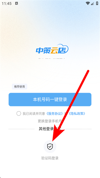 1、打开中策云店,在服务协议弹窗中,点击同意,进入登录选择界面。