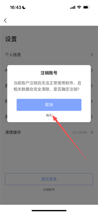 5、在注销弹窗中,点击确定按钮,即可完成账号注销操作。