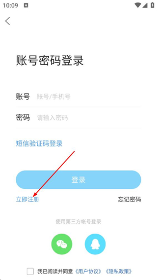 3、在账号登录页面,点击立即注册选项,进入输入手机号的注册页面。