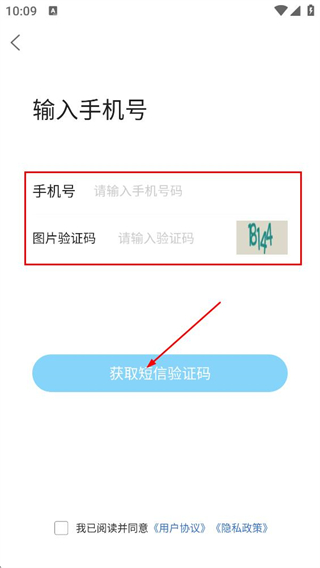 4、在输入手机号页面,填写请输入手机号与图片验证码,点击获取短信验证码。