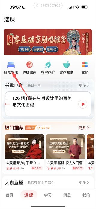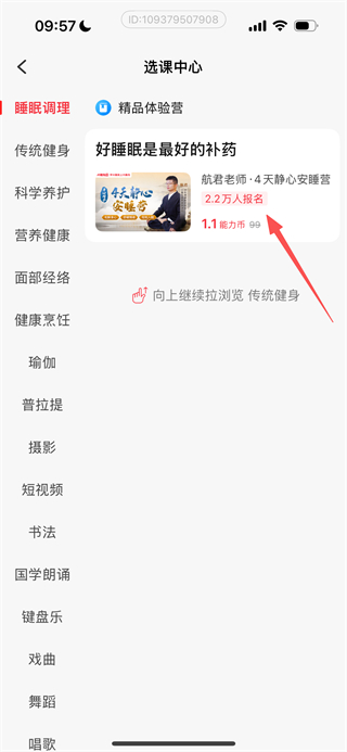 2、在选课页面,点击睡眠调理分类,进入对应的选课中心页面。