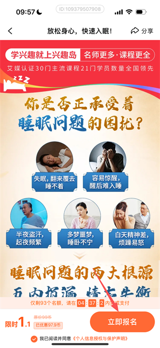 4、在课程详情页,勾选协议后点击立即报名,即可报名课程。