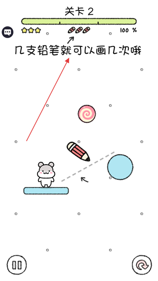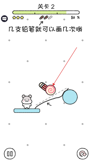 2、用铅笔绘制曲线连接仓鼠与蓝色圆球,消耗铅笔次数,推进关卡进度。