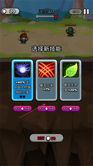 4、波次21后解锁选择新技能界面,可选暴击率+7%等技能,消耗硬币强化角色。