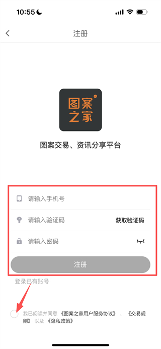 3、在注册页面,勾选协议后填写信息,点击注册完成账号注册。