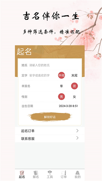 1、可以在线查看名字,输入宝宝相关的信息,解锁好运就可以查看精选的好名字;