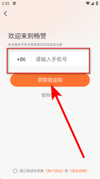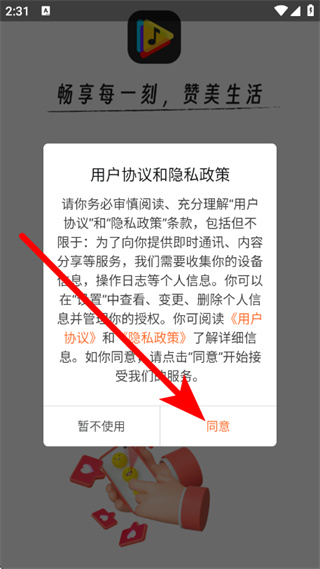 1、打开畅赞,在用户协议弹窗中,点击同意。