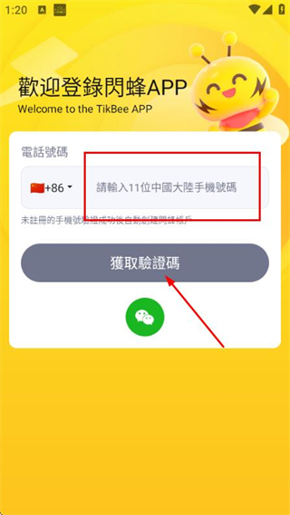 3、在手机验证登录页面填写手机号后,点击获取验证码。
