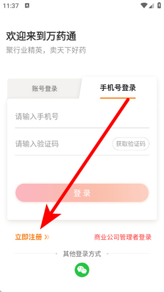 1、打开万药通,在登录页面,点击立即注册,进入新用户注册界面。