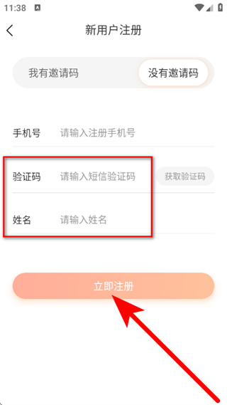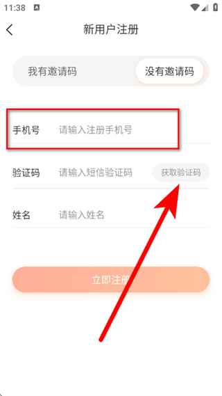 3、在无邀请码注册页面,输入注册手机号,点击获取验证码。