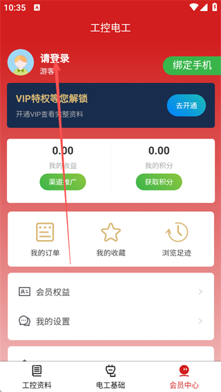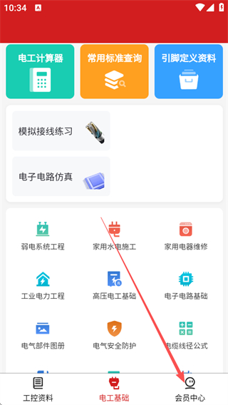 1、在工控电工助手电工基础页面,点击底部导航栏的会员中心选项进入对应页面。