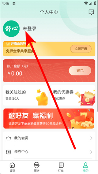 2、在个人中心页面,点击未登录,进入登录界面。