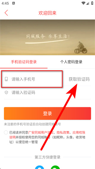3、在手机验证码登录页面,输入手机号,点击获取验证码。