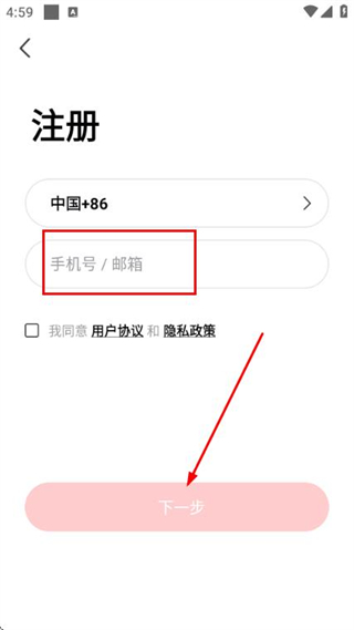 2、在注册账号页面手机号码输入框填写号码后,点击下一步按钮。