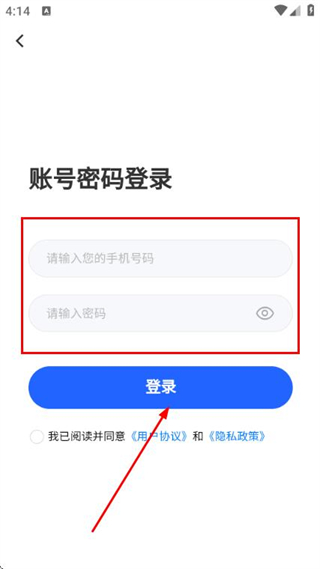 3、在账号密码登录页面填写手机号和密码,勾选协议后,点击登录按钮完成账号登录操作。