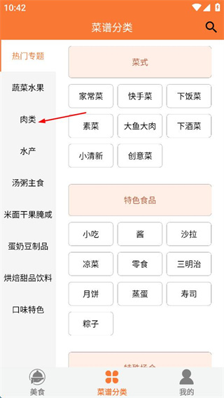 3、在菜谱分类页面左侧列表,点击肉类选项,查看对应的菜品分类。