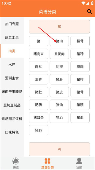 4、在肉类分类下,选择猪肉相关选项,查看以猪肉为食材的菜谱内容。