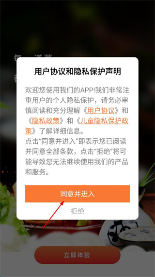 1、在软件弹出的用户协议弹窗中,点击同意并进入按钮,进入主界面。