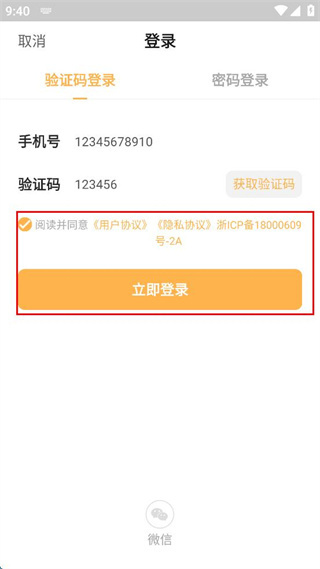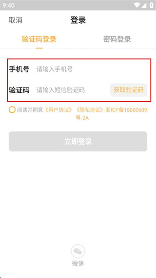 3、在登录界面选择验证码登录,填写对应的手机号和验证码信息。