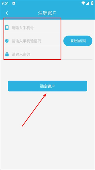 4、在注销账户页面填写手机号、验证码、密码后,点击确定销户按钮完成账户注销操作。