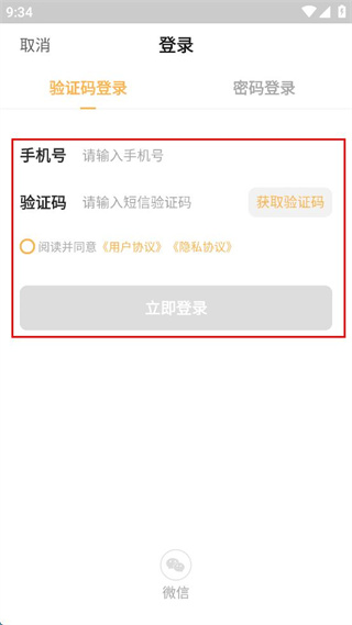 4、在登录界面选择验证码登录,填写手机号和验证码并勾选协议,点击立即登录。