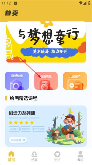 1、在全能画板2的首页,点击绘画填色选项,进入画画专辑页面。