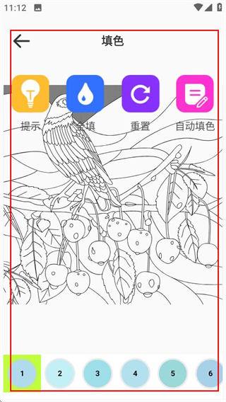 3、在填色页面,使用底部颜色选项为作品上色,完成绘画填色操作。