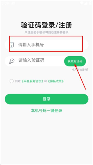 2、在登录页面填写手机号,勾选协议后,点击获取验证码。