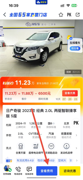 3、在车辆详情页面,找到并点击查看费用按钮,进入购车费用的明细查询界面,确认费用信息。