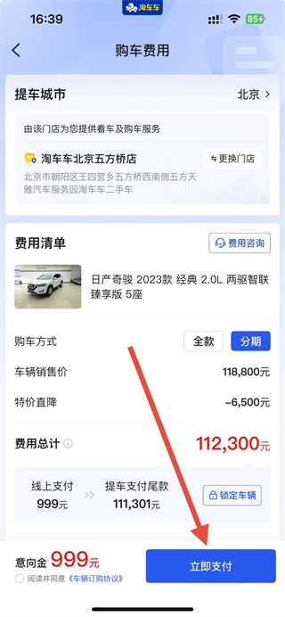4、在购车费用页面,选择购车方式后,勾选协议并点击立即支付按钮,完成意向金支付即可下单锁定车辆。