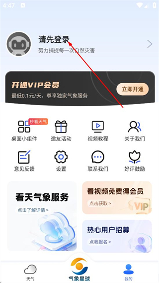 1、在看天气应用首页,点击底部导航栏的我的,进入个人页面。