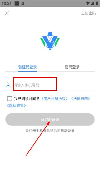 2、在手机验证登录页面填写手机号,勾选协议后,点击获取验证码。