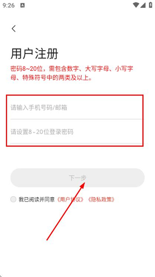 2、在注册账号页面输入手机号、密码后,点击下一步按钮。