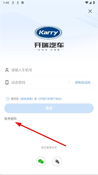 2、在登录页面,点击账号密码选项,切换至密码登录模式框。