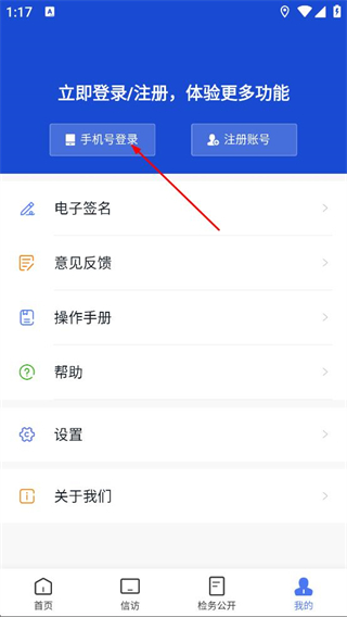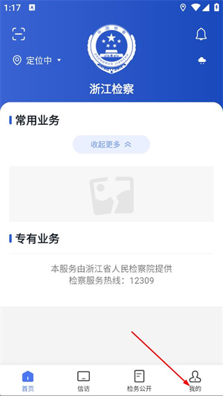 1、在浙江检察首页,点击底部导航栏的我的,进入个人页面。
