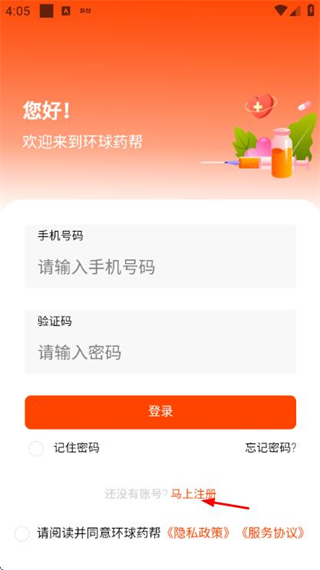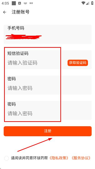 3、在注册账号页面填写验证码和密码,勾选协议后点击注册按钮完成账号注册操作。