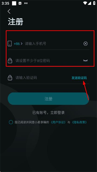 2、在注册账号页面手机号码输入框填写手机号和密码后,点击发送验证码按钮。