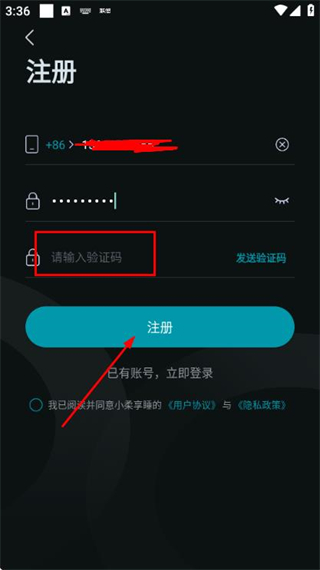 3、在注册账号页面填写验证码,勾选协议后点击注册按钮完成账号注册操作。