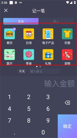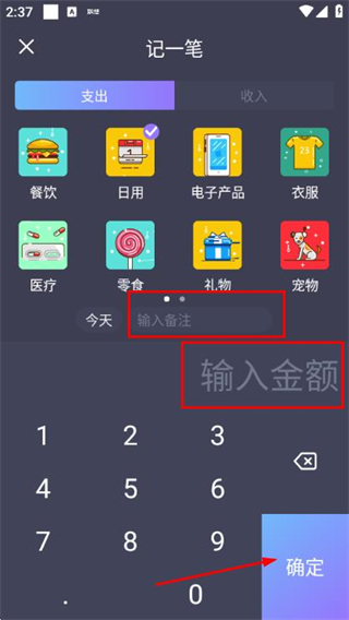 3、在记账信息填写界面输入备注、金额后,点击确定按钮,完成本次记账操作。