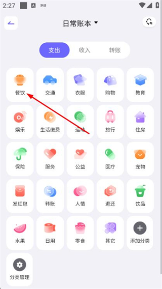 1、在明细页面点击记一笔按钮,进入记账分类选择页面。