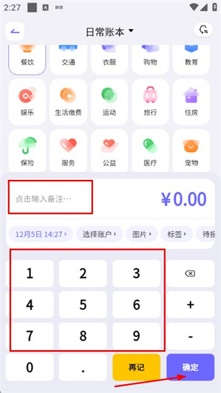 3、在记账信息填写页面输入备注、金额后,点击确定按钮,完成本次记账操作。