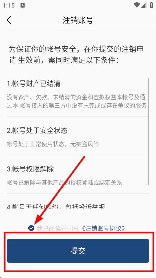 5、阅读注销账号需满足的条件,勾选我已阅读并同意《注销账号协议》,点击提交,按提示完成后续操作即可注销账号。