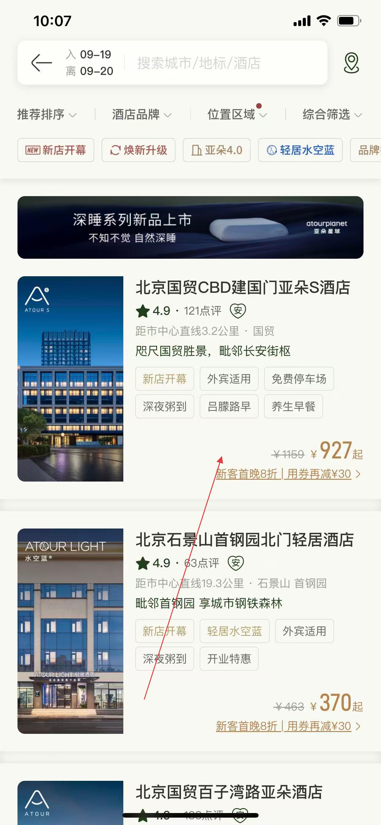 3、按位置和时间需求,筛选符合条件的亚朵酒店。