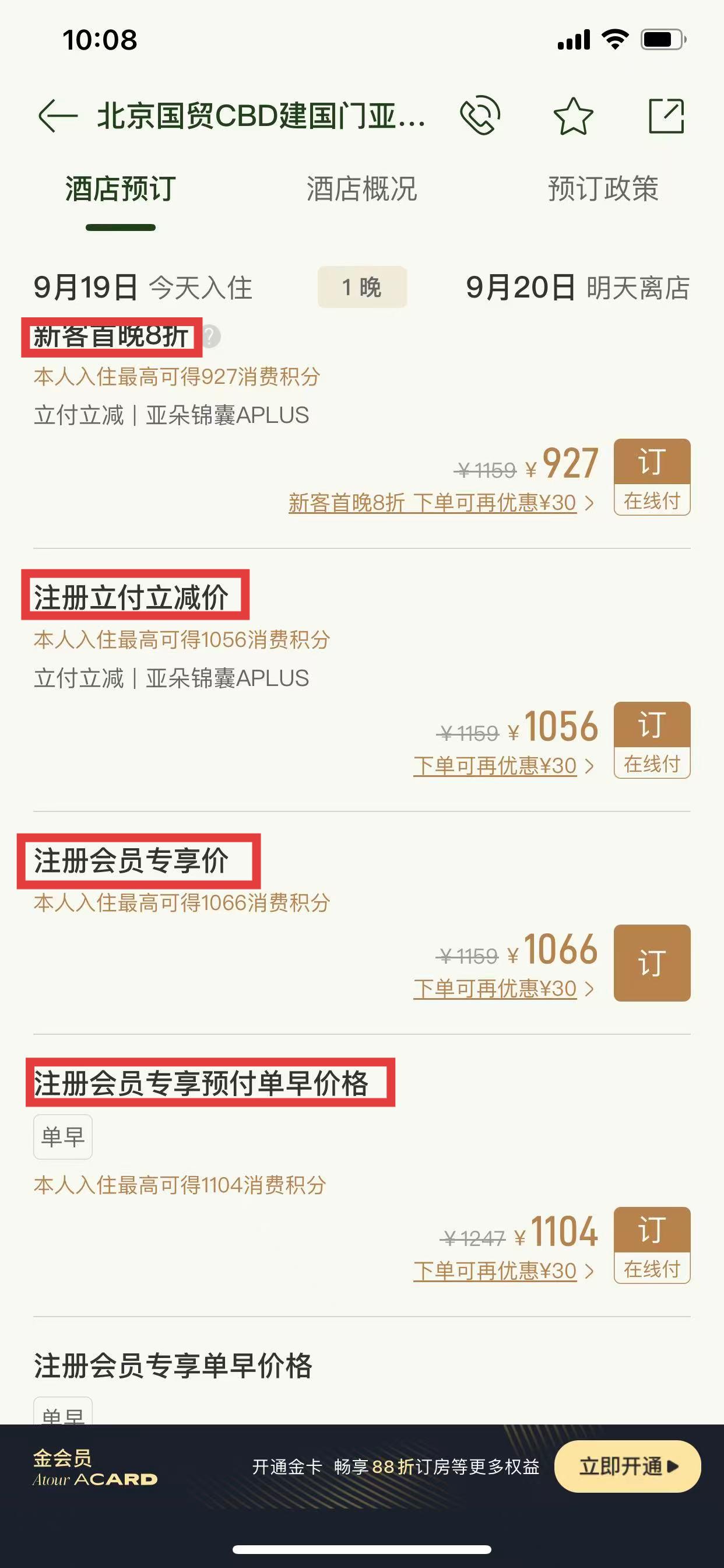5、对比带有新客首晚8折、注册立付立减价、注册会员专享价等标注的价格,选择最便宜的房型。
