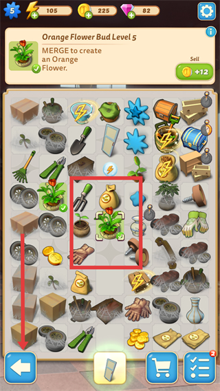 3、合并之后,直至合成任务目标的花苗,即可点击下方箭头。