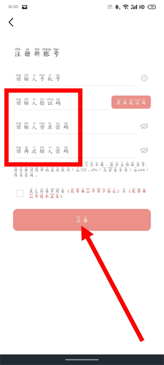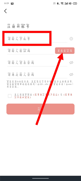4、输入验证码,设置密码,勾选相关协议后,点击注册,完成账号注册。