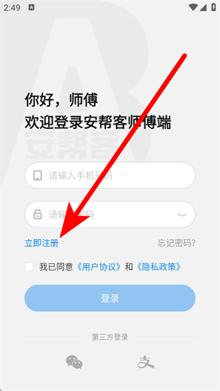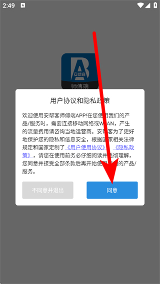 1、打开安帮客,在弹出的用户协议弹窗中,点击同意。