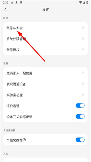 2、进入设置页面后,找到账号与安全选项并点击,进入账号安全界面。